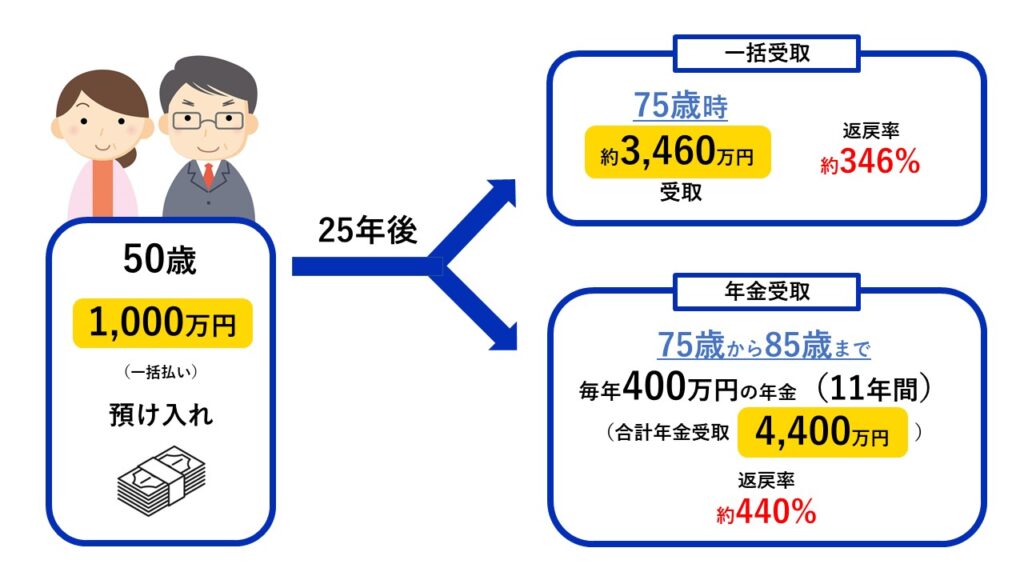 75歳から85歳までの11年、毎年400万円年金受取(受取総額4,400万円)収支+3,400万円 返戻率約440%