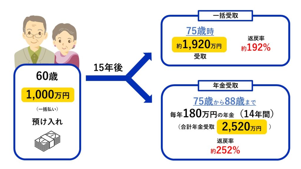 75歳から88歳までの14年、毎年180万円年金受取(受取総額2,520万円) 収支+1,520万円 返戻率約252%